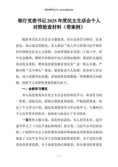 【七哥公文】2026年:银行党委书记2025年度民主生活会个人对照检查材料(带案例)+更多免费公文+VX:QiGeGongWen2024