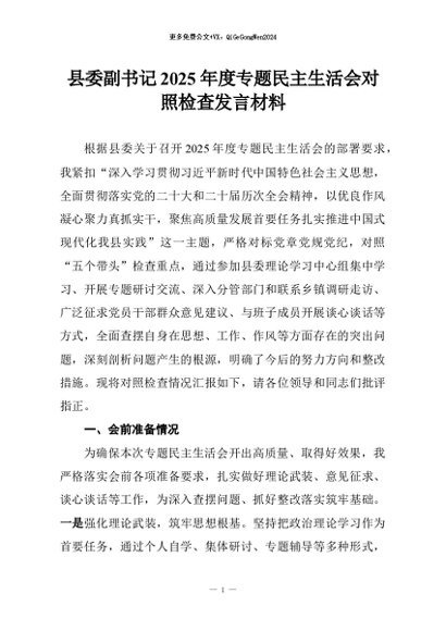 【七哥公文】2026年:县委副书记2025年度专题民主生活会对照检查发言材料+更多免费公文+VX:QiGeGongWen2024