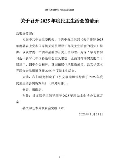 / 【七哥公文】2026年:关于召开2025年度民主生活会的请示+更多免费公文+VX:QiGeGongWen2024