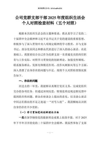 【七哥公文】2026年:公司党群支部干部2025年度组织生活会个人对照检查材料(五个对照)+更多免费公文+VX:QiGeGongWen2024