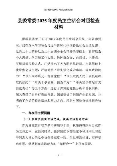 / 【七哥公文】2026年:县委常委2025年度民主生活会对照检查材料+更多免费公文+VX:QiGeGongWen2024