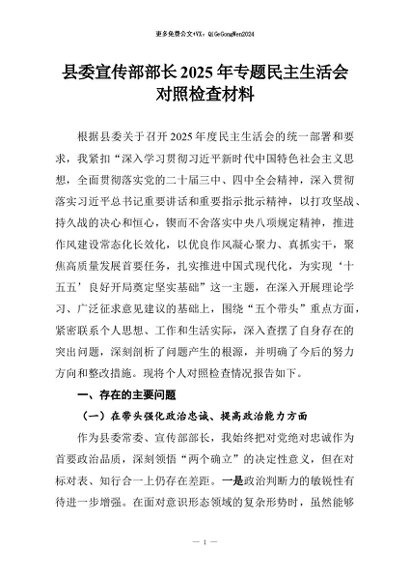 【七哥公文】2026年:县委宣传部部长2025年专题民主生活会对照检查材料+更多免费公文+VX:QiGeGongWen2024