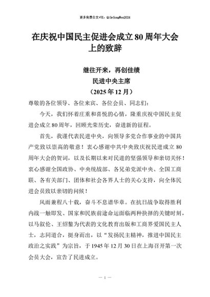 / 【七哥公文】2026年:在庆祝中国民主促进会成立80周年大会上的致辞+更多免费公文+VX:QiGeGongWen2024