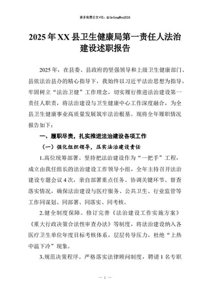 【七哥公文】2026年:2025年XX县卫生健康局第一责任人法治建设述职报告+更多免费公文+VX:QiGeGongWen2024
