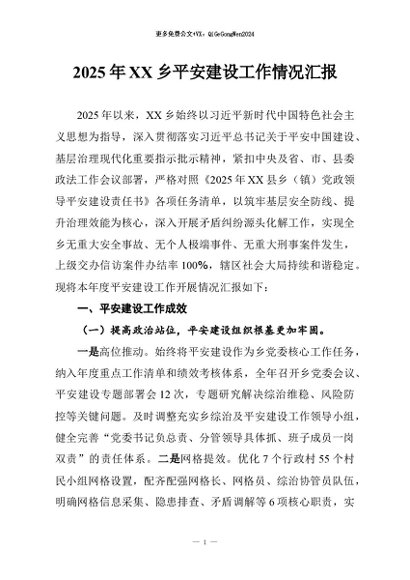 【七哥公文】2026年:2025年XX乡平安建设工作情况汇报+更多免费公文+VX:QiGeGongWen2024