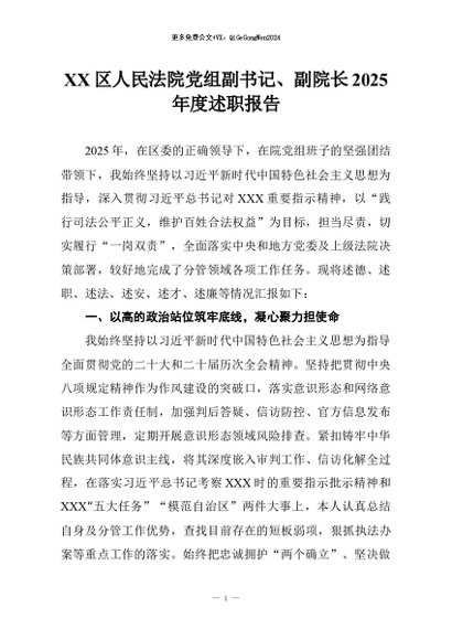 【七哥公文】2026年:XX区人民法院党组副书记、副院长2025年度述职报告+更多免费公文+VX:QiGeGongWen2024