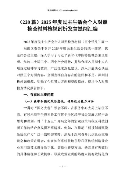 【七哥公文】2026年:(220篇)2025年度民主生活会个人对照检查材料检视剖析发言提纲汇编+更多免费公文+VX:QiGeGongWen2024