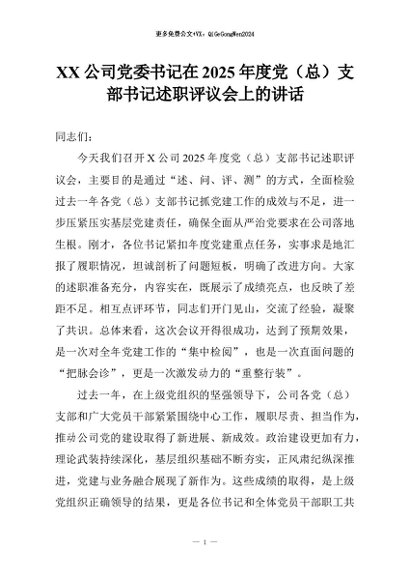 【七哥公文】2026年:XX公司党委书记在2025年度党(总)支部书记述职评议会上的讲话+更多免费公文+VX:QiGeGongWen2024
