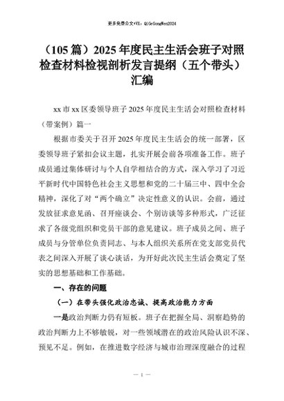 【七哥公文】2026年:(105篇)2025年度民主生活会班子对照检查材料检视剖析发言提纲(五个带头)汇编+更多免费公文+VX:QiGeGongWen2024