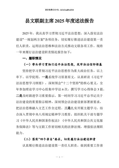 【七哥公文】2026年:县文联副主席2025年度述法报告+更多免费公文+VX:QiGeGongWen2024