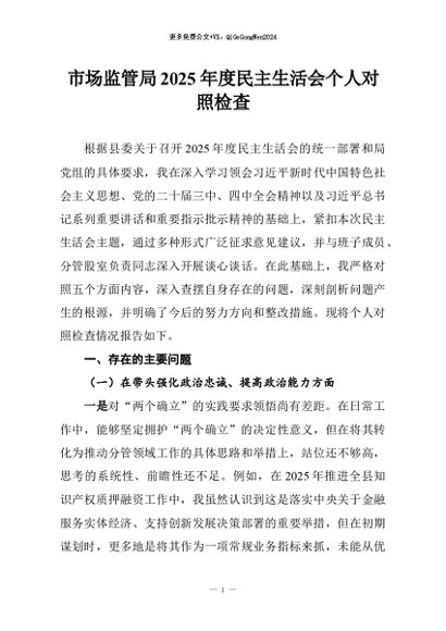 / 【七哥公文】2026年:市场监管局2025年度民主生活会个人对照检查+更多免费公文+VX:QiGeGongWen2024