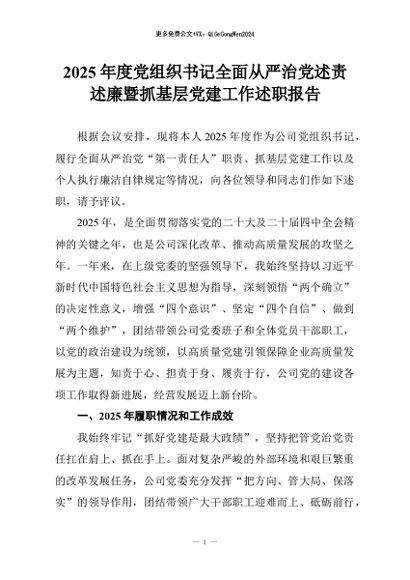 【七哥公文】2026年:2025年度党组织书记全面从严治党述责述廉暨抓基层党建工作述职报告+更多免费公文+VX:QiGeGongWen2024