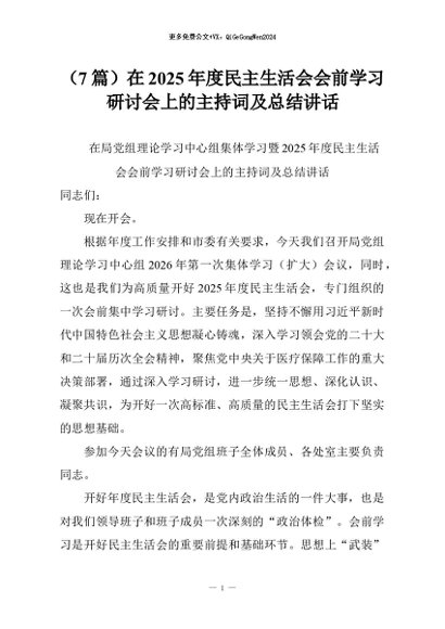 【七哥公文】2026年:(7篇)在2025年度民主生活会会前学习研讨会上的主持词及总结讲话+更多免费公文+VX:QiGeGongWen2024
