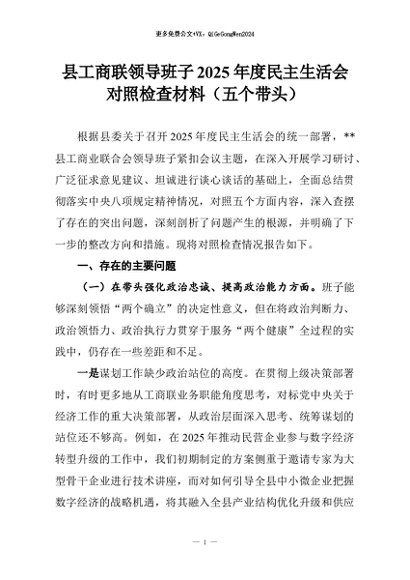 【七哥公文】2026年:县工商联领导班子2025年度民主生活会对照检查材料(五个带头)+更多免费公文+VX:QiGeGongWen2024