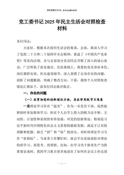 / 【七哥公文】2026年:党工委书记2025年民主生活会对照检查材料+更多免费公文+VX:QiGeGongWen2024