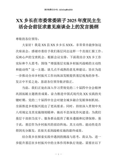 【七哥公文】2026年:XX乡长在市委常委班子2025年度民主生活会会前征求意见座谈会上的发言提纲+更多免费公文+VX:QiGeGongWen2024