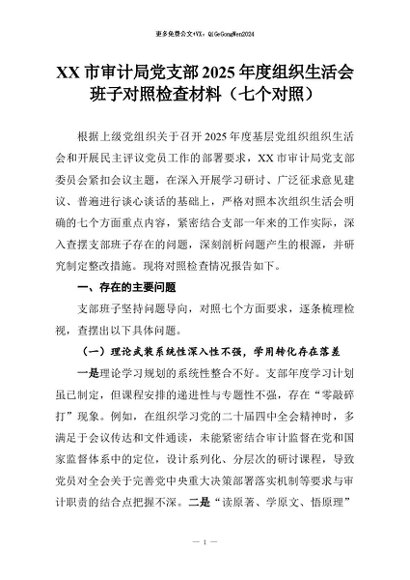 【七哥公文】2026年:XX市审计局党支部2025年度组织生活会班子对照检查材料(七个对照)+更多免费公文+VX:QiGeGongWen2024