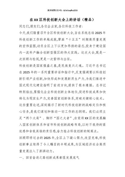 / 【七哥公文】2026年:在XX区科技创新大会上的讲话(精品)_副本+更多免费公文+VX:QiGeGongWen2024