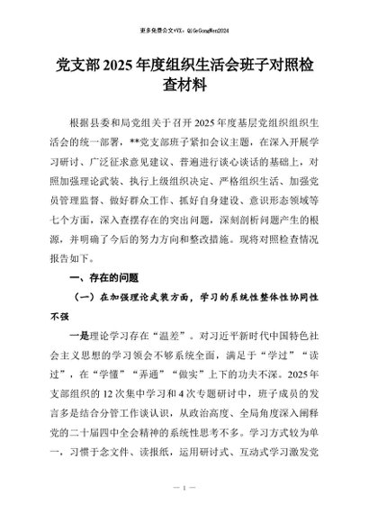 【七哥公文】2026年:党支部2025年度组织生活会班子对照检查材料+更多免费公文+VX:QiGeGongWen2024