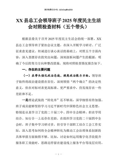 【七哥公文】2026年:XX县总工会领导班子2025年度民主生活会对照检查材料(五个带头)+更多免费公文+VX:QiGeGongWen2024