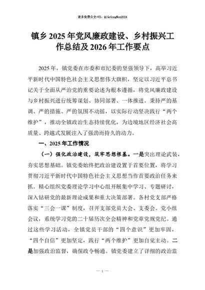 【七哥公文】2026年:镇乡2025年党风廉政建设、乡村振兴工作总结及2026年工作要点+更多免费公文+VX:QiGeGongWen2024