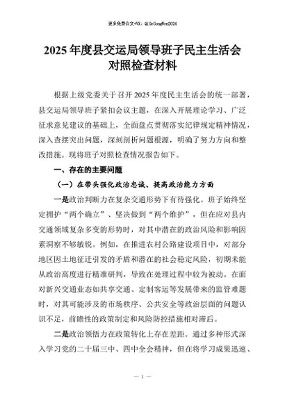 【七哥公文】2026年:2025年度县交运局领导班子民主生活会对照检查材料+更多免费公文+VX:QiGeGongWen2024