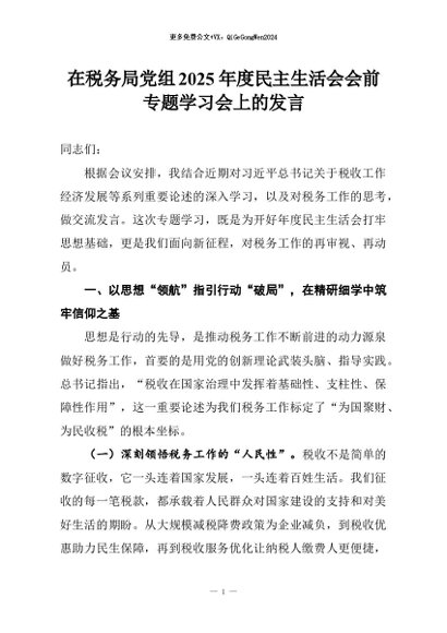 【七哥公文】2026年:在税务局党组2025年度民主生活会会前专题学习会上的发言+更多免费公文+VX:QiGeGongWen2024