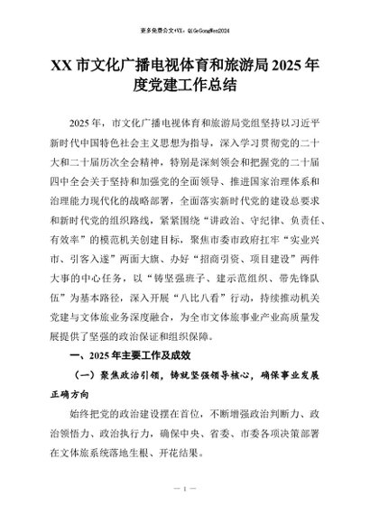 【七哥公文】2026年:XX市文化广播电视体育和旅游局2025年度党建工作总结+更多免费公文+VX:QiGeGongWen2024