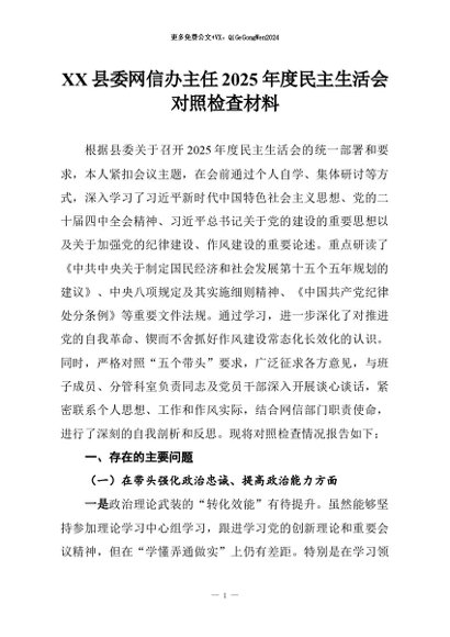 【七哥公文】2026年:XX县委网信办主任2025年度民主生活会对照检查材料+更多免费公文+VX:QiGeGongWen2024