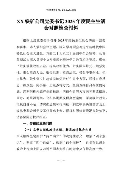 【七哥公文】2026年:XX铁矿公司党委书记2025年度民主生活会对照检查材料+更多免费公文+VX:QiGeGongWen2024