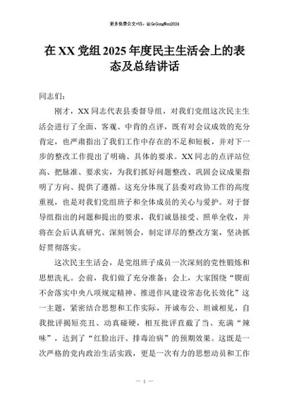 【七哥公文】2026年:在XX党组2025年度民主生活会上的表态及总结讲话+更多免费公文+VX:QiGeGongWen2024