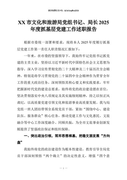 【七哥公文】2026年:XX市文化和旅游局党组书记、局长2025年度抓基层党建工作述职报告+更多免费公文+VX:QiGeGongWen2024