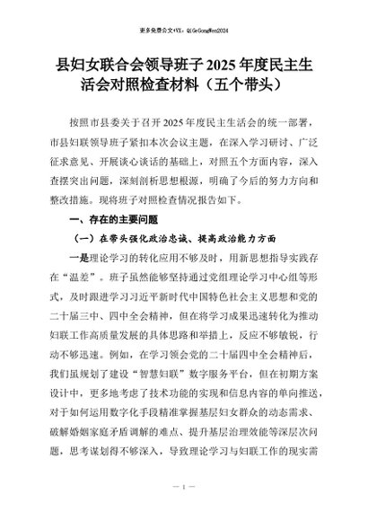 【七哥公文】2026年:县妇女联合会领导班子2025年度民主生活会对照检查材料(五个带头)+更多免费公文+VX:QiGeGongWen2024