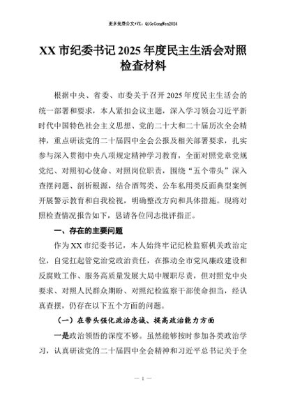 【七哥公文】2026年:XX市纪委书记2025年度民主生活会对照检查材料+更多免费公文+VX:QiGeGongWen2024