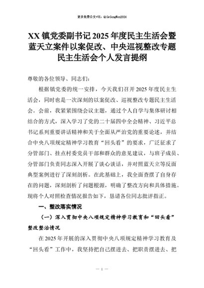 【七哥公文】2026年:XX镇党委副书记2025年度民主生活会暨蓝天立案件以案促改、中央巡视整改专题民主生活会个人发言提纲+更多免费公文+VX:QiGeGongWen2024
