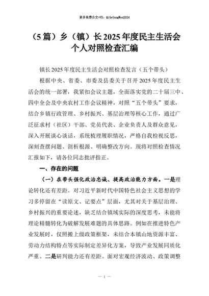 【七哥公文】2026年:(5篇)乡(镇)长2025年度民主生活会个人对照检查汇编+更多免费公文+VX:QiGeGongWen2024