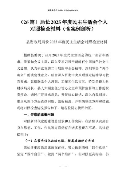 【七哥公文】2026年:(26篇)局长2025年度民主生活会个人对照检查材料(含案例剖析)+更多免费公文+VX:QiGeGongWen2024