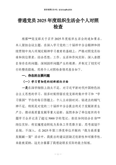 【七哥公文】2026年:普通党员2025年度组织生活会个人对照检查+更多免费公文+VX:QiGeGongWen2024