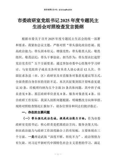 【七哥公文】2026年:市委政研室党组书记2025年度专题民主生活会对照检查发言提纲+更多免费公文+VX:QiGeGongWen2024