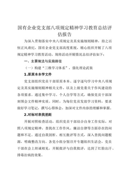【七哥公文】2025年:国有企业党支部八项规定精神学习教育总结评估报告+更多免费公文+VX:QiGeGongWen2024