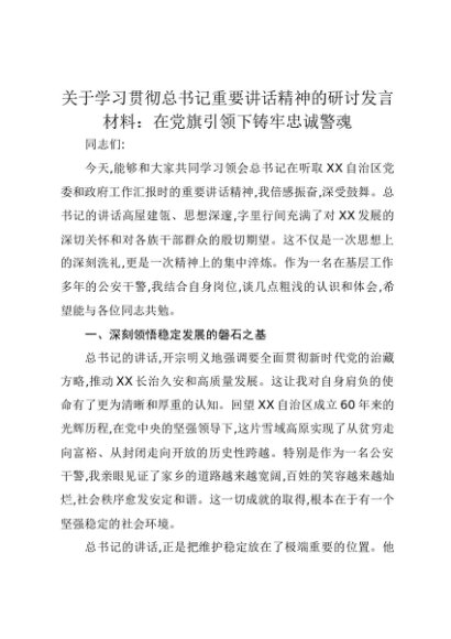 【七哥公文】2025年:关于学习贯彻总书记重要讲话精神的研讨发言材料:在党旗引领下铸牢忠诚警魂+更多免费公文+VX:QiGeGongWen2024