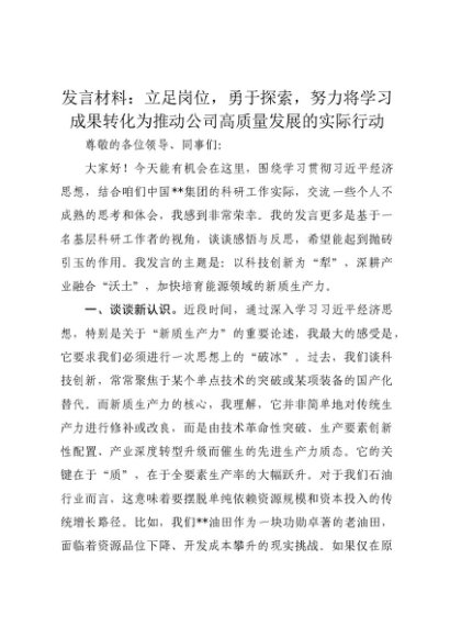 【七哥公文】2025年:发言材料:立足岗位,勇于探索,努力将学习成果转化为推动公司高质量发展的实际行动+更多免费公文+VX:QiGeGongWen2024