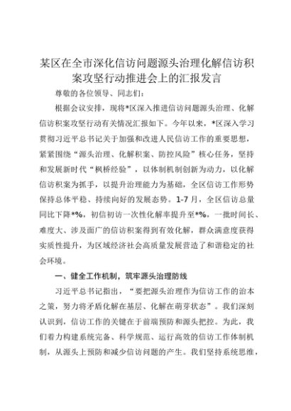 【七哥公文】2025年:某区在全市深化信访问题源头治理化解信访积案攻坚行动推进会上的汇报发言+更多免费公文+VX:QiGeGongWen2024