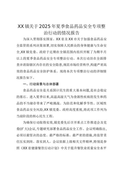 【七哥公文】2025年:XX镇关于2025年夏季食品药品安全专项整治行动的情况报告+更多免费公文+VX:QiGeGongWen2024
