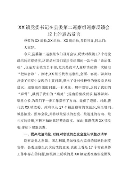 【七哥公文】2025年:XX镇党委书记在县委第二巡察组巡察反馈会议上的表态发言+更多免费公文+VX:QiGeGongWen2024