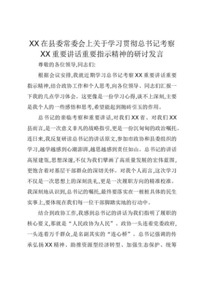【七哥公文】2025年:XX在县委常委会上关于学习贯彻总书记考察XX重要讲话重要指示精神的研讨发言+更多免费公文+VX:QiGeGongWen2024