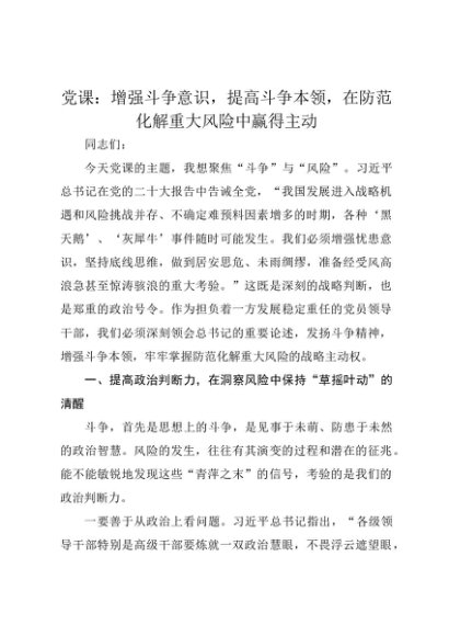 【七哥公文】2025年:党课讲稿:增强斗争意识,提高斗争本领,在防范化解重大风险中赢得主动+更多免费公文+VX:QiGeGongWen2024