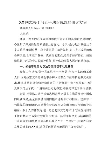 【七哥公文】2025年:XX同志关于习近平法治思想的研讨发言+更多免费公文+VX:QiGeGongWen2024