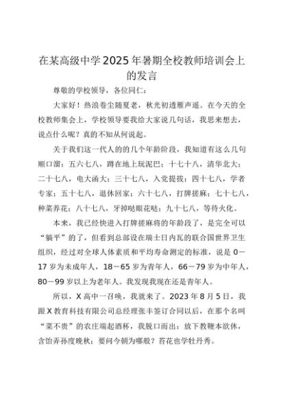 【七哥公文】2025年:在某高级中学2025年暑期全校教师培训会上的发言:“爱人者,人恒爱之;敬人者,人恒敬之+更多免费公文+VX:QiGeGongWen2024