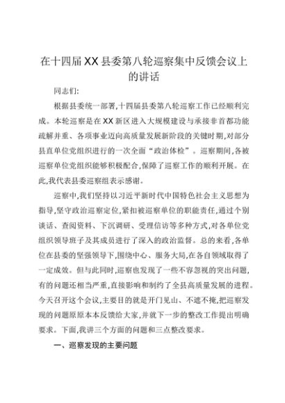 / 【七哥公文】2025年:在十四届XX县委第八轮巡察集中反馈会议上的讲话+更多免费公文+VX:QiGeGongWen2024